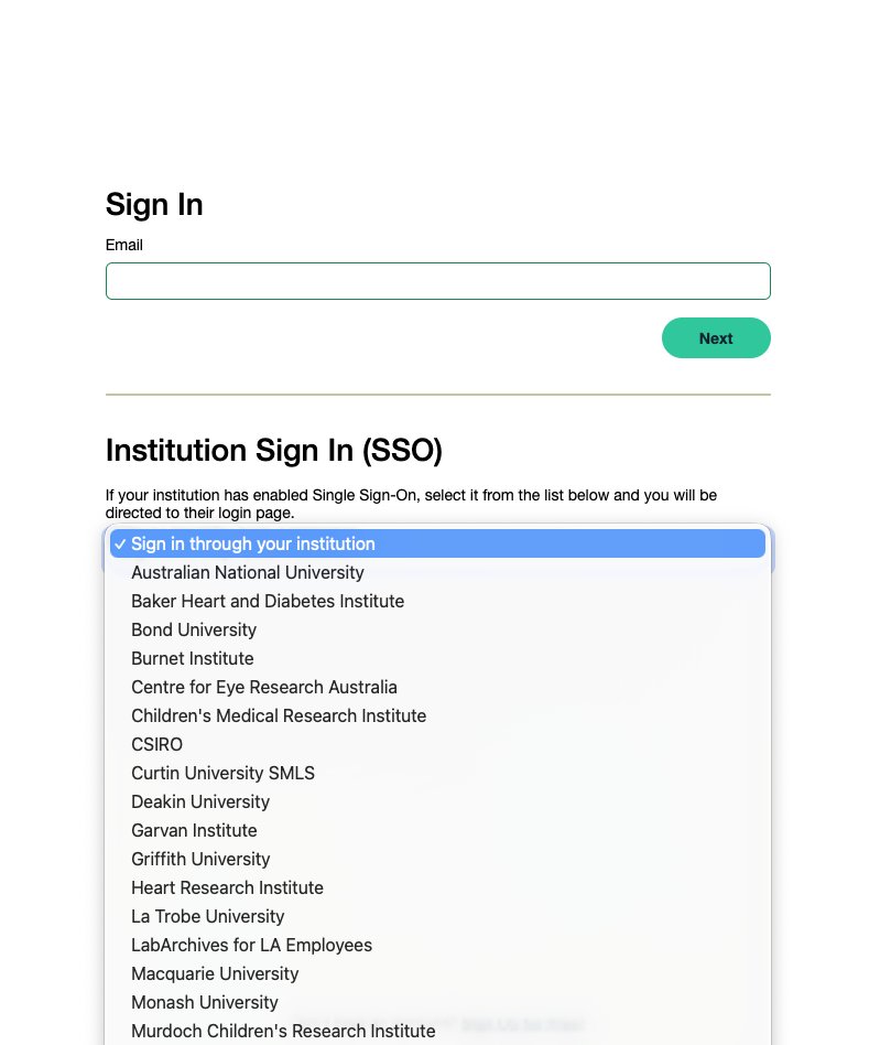 2. Under Institution Sign In (SSO), select The University of Queensland as the institution. Note: Users who are already logged in to UQ via a session in their browser will be automatically directed to Step 4.